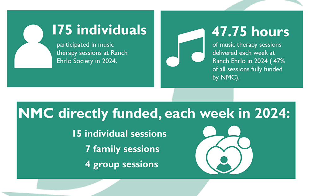 In 2023, music therapy expanded to include the Family Treatment Program (FTP), Family Centred Addictions Program (FCAP), Group Living Treatment Services (GLTS), and the LGBTQ2 True Colour program. NMC funding also supported a paid internship for a music therapy student, which led to the graduate joining Ranch Ehrlo as a second certified music therapist in 2024.